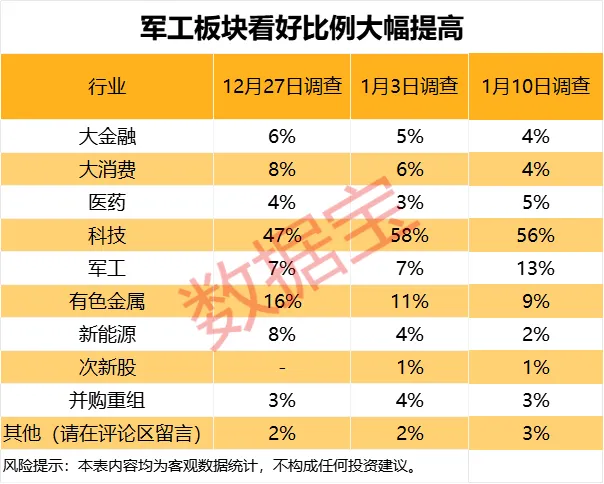 從板塊來看,看好軍工板塊的投資者比例大幅提高,環比提升6個百分點。