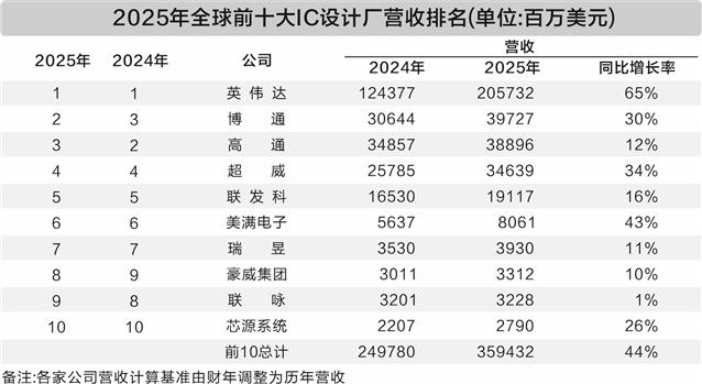 受人工智能(AI)浪潮推動,全球前十大芯片設計企業營業收入水漲船高。據統計,2025年全球前十大IC設計公司合計營收超3594億美元,同比增長44%,英偉達蟬聯營收冠軍,博通反超高通成為第二名。另外,A股IC設計龍頭豪威集團排名提升至全球第八名。