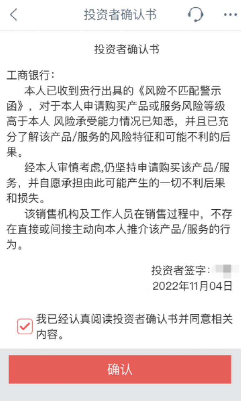 以在中國工商銀行為例,中國基金記者以投資者身份填寫相關測評得出風險承受能力為C1-保守型,工商銀行給出的投資者類型及風險匹配告知書顯示,根據(jù)銀行的投資者與產(chǎn)品、服務風險等級匹配規(guī)則,記者可購買銀行風險等級不高于PR1或者R1-低風險的理財或基金產(chǎn)品或服務。但當記者選擇了一款R4-較高風險產(chǎn)品時,該行出具了《風險不匹配警示函》,隨后記者只需簽署投資者確認書,便可繼續(xù)購買較高風險產(chǎn)品。