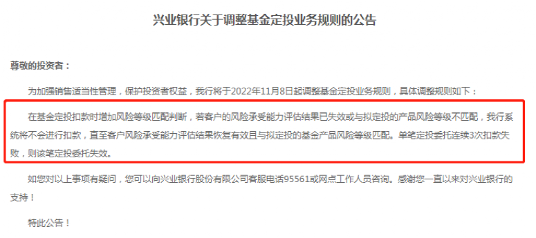 根據(jù)興業(yè)銀行近期發(fā)布的公告,為加強銷售適當性管理,保護投資者權益,該行將于11月8日起調整基金定投業(yè)務規(guī)則。