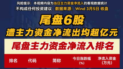 尾盤6股遭主力資金凈流出均超億元